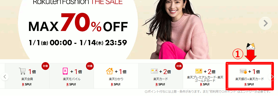 楽天トップのSPU「楽天銀行+楽天カード」をクリックします。