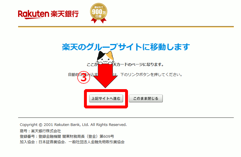 ③楽天銀行のサイトへ移動するために「上記サイトへ進む」をクリックします。