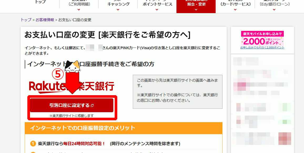 ②ページが開いたら楽天口座をお持ちのかたは「楽天銀行に引落口座を設定する」をクリックします。