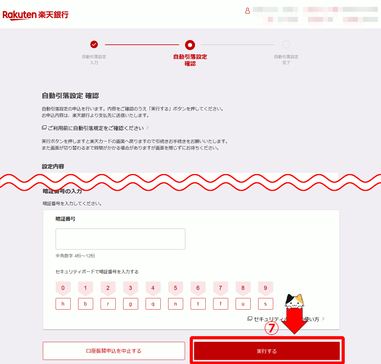 ⑦自動引落設定の確認ページが開くので、楽現銀行の暗証番号を入力して「実行する」をクリックします。