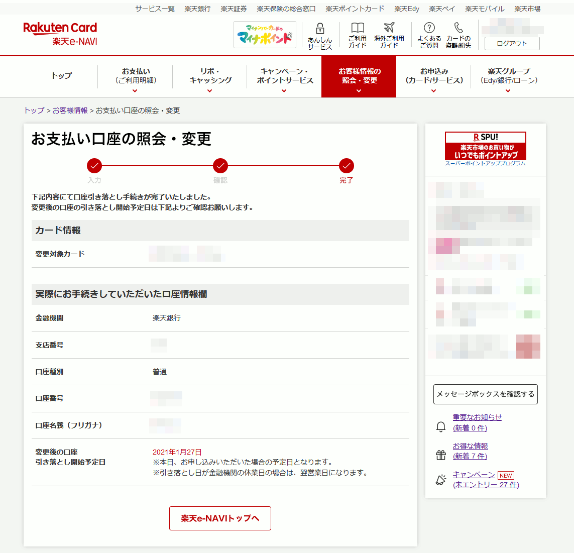 ⑧楽天カードのサイトに戻ってくるので口座情報を確認して終了です。
